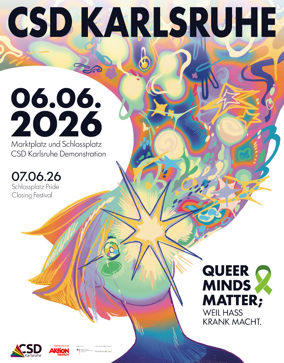 Weil Hass krank macht.Die Vorbereitungen für den CSD 2026 haben begonnen. Der CSD Karlsruhe stellt 2026 die psychosoziale Gesundheit queerer Menschen in den Mittelpunkt – Diskriminierung bleibt nicht folgenlos. Queere Menschen sind in besonderer Weise von psychischen Belastungen betroffen. Diskriminierung, Ausgrenzung und strukturelle Benachteiligung erhöhen signifikant das Risiko für Depressionen, Angststörungen, Suchterkrankungen und Suizidalität. Der CSD Karlsruhe versteht sein diesjähriges Motto daher als politischen Auftrag: Niemand soll mit den Folgen von Ausgrenzung alleine bleiben.