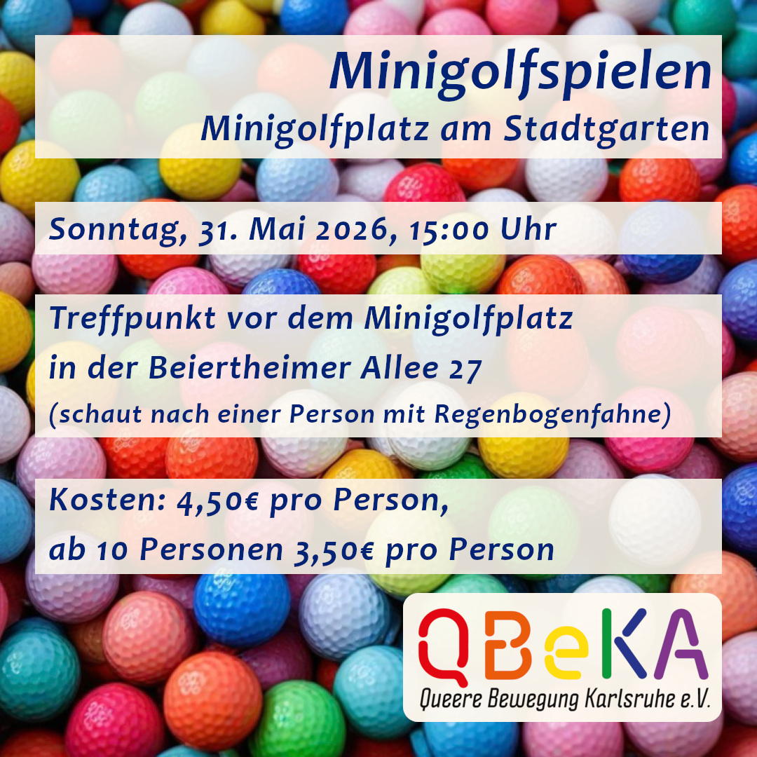 Wir laden zum gemeinsamen Minigolfspielen in queerer Atmosphäre auf 18 Bahnen ein. Egal ob Anfänger, Profi oder etwas dazwischen, es geht um den Spaß. Kosten: 4,50€ pro Person, ab 10 Personen 3,50€ pro Person. Treffpunkt: Minigolfplatz am Zoo, Beiertheimer Allee 27 (schaut nach einer Person mit einer Regenbogenfahne)
