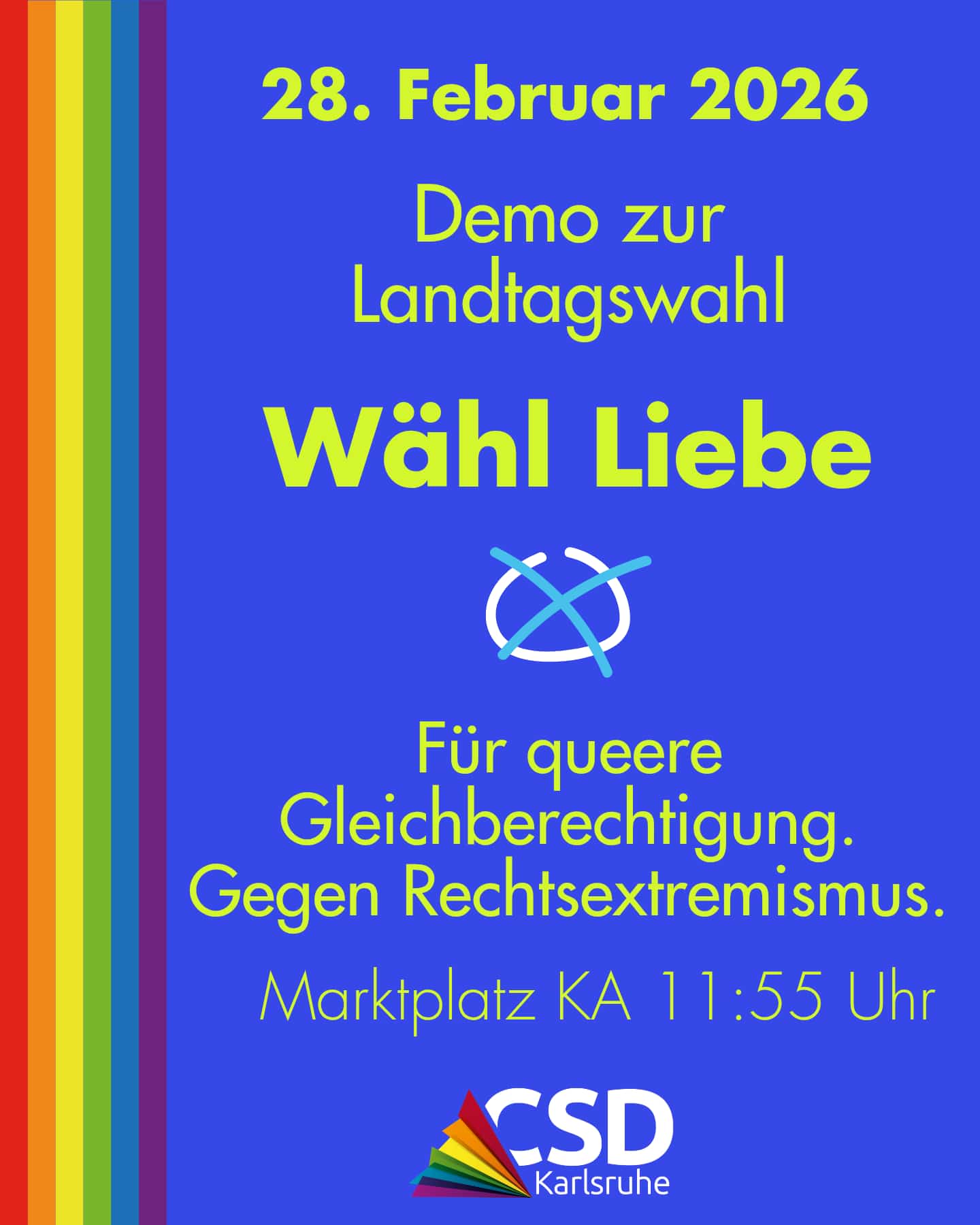 Im Vorfeld der Landtagswahl gehen wir unter dem Motto „Wähl Liebe“ für queere Gleichberechtigung und gegen Rechtsextremismus auf die Straße. Die Demonstration durch die Karlsruher Innenstadt findet am Samstag, 28. Februar 2026, statt und beginnt um 11:55 Uhr mit einer Kundgebung auf dem Marktplatz in Karlsruhe. Wir demonstrieren mit euch